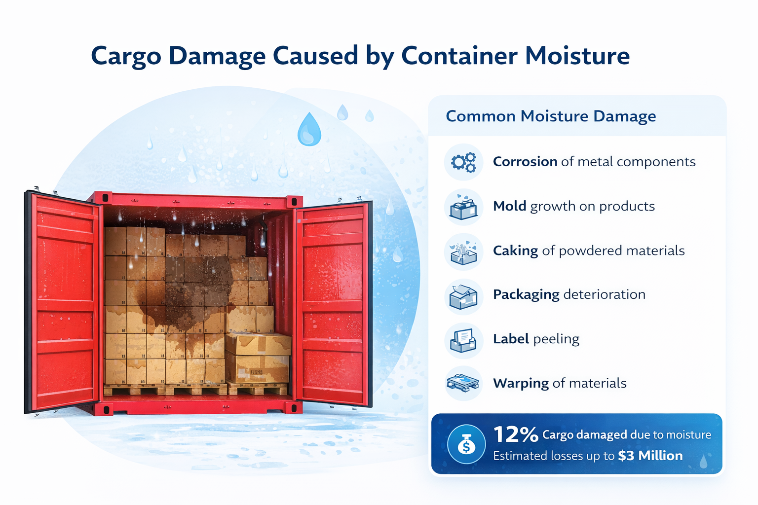 Water droplets may drip onto cargo or form inside packaging, resulting in cargo sweat and product damage.